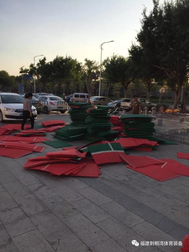 活動現(xiàn)場籃球架及懸浮拼接地板緊張架設(shè)中。期待明天球員精彩的表現(xiàn)!無兄弟,不籃球!